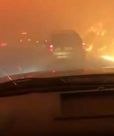 11月8日,美國加利福尼亞州,一位名叫艾倫的父親駕車帶著3歲的女兒撤離比尤特縣天堂鎮(zhèn)。