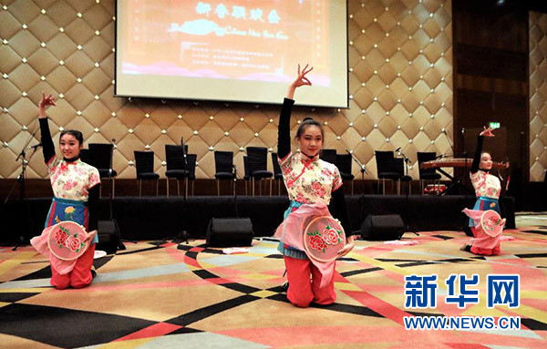 1月30日,在科威特的費爾瓦尼耶省,來自南京藝術團的演員在中國駐科威特使館新春招待會上表演民族舞蹈。新華社發(fā)(約瑟夫 攝)