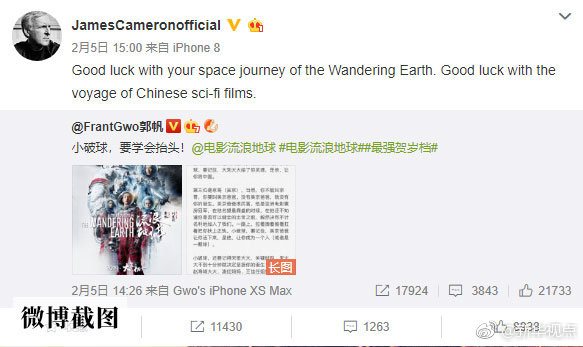 正如好萊塢大導(dǎo)演詹姆斯·卡梅隆在社交媒體上對(duì)《流浪地球》發(fā)出的祝愿:“祝中國科幻電影之旅好運(yùn)!”