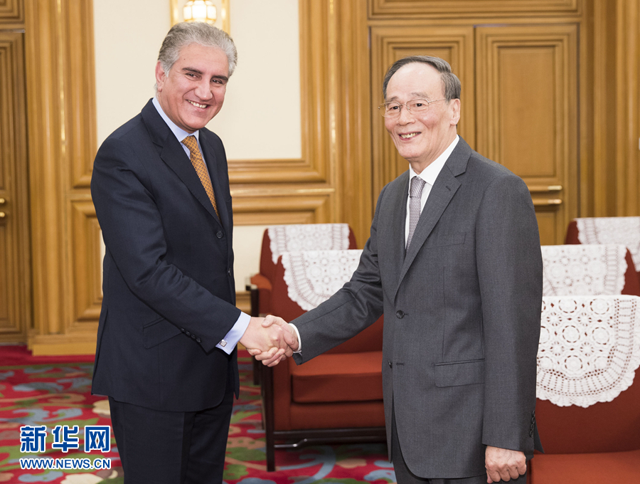 會見庫雷希時,王岐山表示,中巴是好鄰居。中巴友誼歷經(jīng)時間和國際風云變幻考驗,得到兩國人民真心擁護。近年來,兩國領(lǐng)導人往來頻繁,全天候戰(zhàn)略合作伙伴關(guān)系不斷取得新進展。在相互理解、相互信任基礎(chǔ)上建設(shè)睦鄰友好關(guān)系,營造良好周邊環(huán)境,是一國實現(xiàn)和平發(fā)展的重要條件。中方支持巴方抓住機遇、應對挑戰(zhàn),妥善處理鄰國關(guān)系,實現(xiàn)巴基斯坦穩(wěn)定發(fā)展。希望兩國繼續(xù)深化全方位合作,推動中巴經(jīng)濟走廊等“一帶一路”重要先行先試項目取得更多成果。