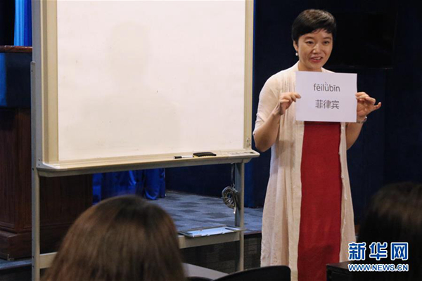 4月12日,在菲律賓馬尼拉,菲律賓大學(xué)孔子學(xué)院的老師孟廣潔為菲律賓總統(tǒng)府新聞部工作人員上課。新華社記者 鄭昕 攝