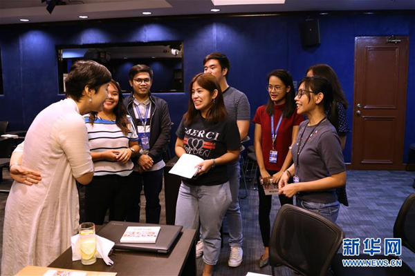 4月12日,在菲律賓馬尼拉,菲律賓總統(tǒng)府新聞部工作人員向菲律賓大學(xué)孔子學(xué)院的老師孟廣潔(左一)詢問漢語學(xué)習(xí)的各種問題。新華社記者 袁夢晨 攝