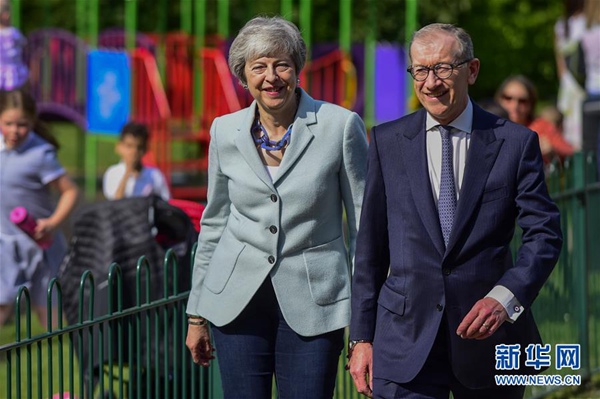 5月23日,在英國(guó)桑寧,英國(guó)首相特雷莎·梅(左)抵達(dá)投票站。新華社發(fā)(史蒂芬·程 攝)