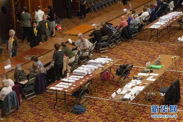 5月26日,在英國(guó)南安普敦的一個(gè)計(jì)票站,工作人員進(jìn)行計(jì)票。新華社發(fā)(雷伊·唐 攝)