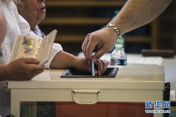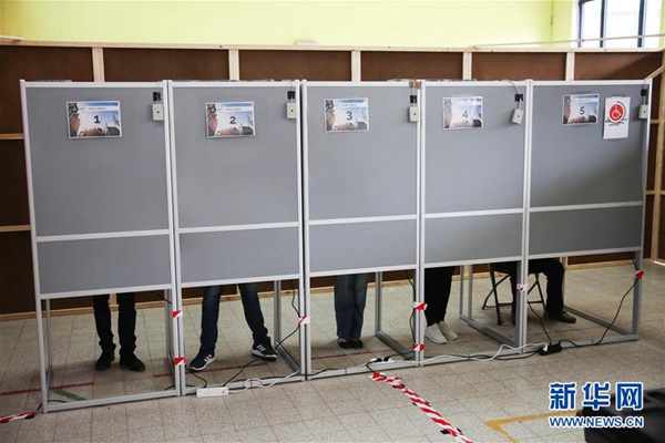 5月26日,在比利時(shí)布魯塞爾,選民在一處投票站準(zhǔn)備投票。新華社記者 鄭煥松 攝