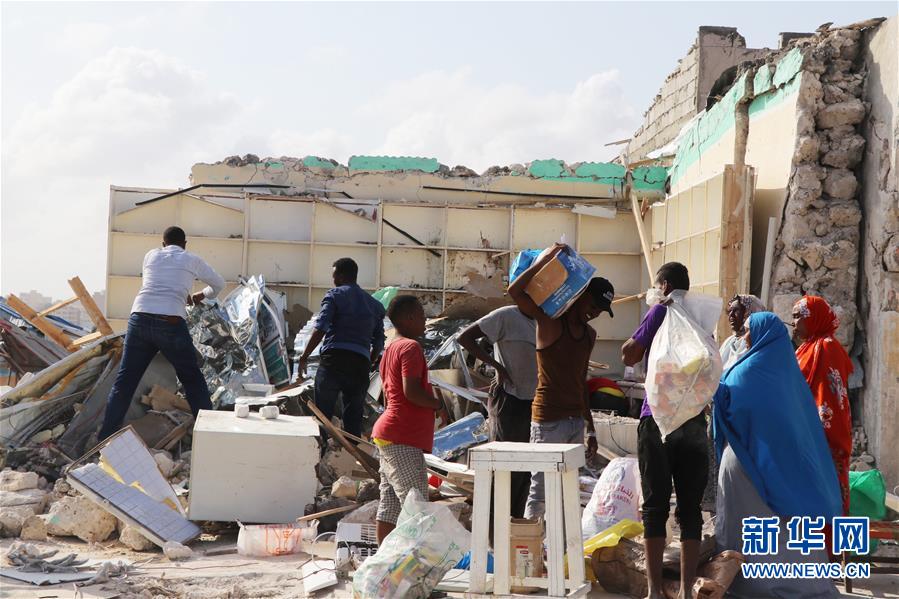 6月15日,在索馬里首都摩加迪沙,人們從汽車炸彈襲擊損壞的房屋中清理物品。新華社發(fā)(哈桑 攝)