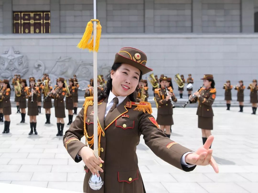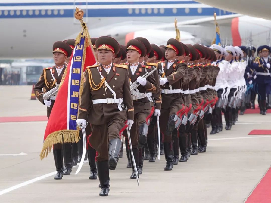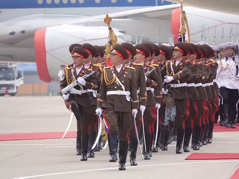 朝方在機(jī)場(chǎng)舉行隆重歡迎儀式。在21響禮炮聲中,軍樂隊(duì)奏中朝兩國(guó)國(guó)歌,習(xí)近平在金正恩陪同下檢閱了朝鮮人民軍三軍儀仗隊(duì),并觀看了分列式表演。