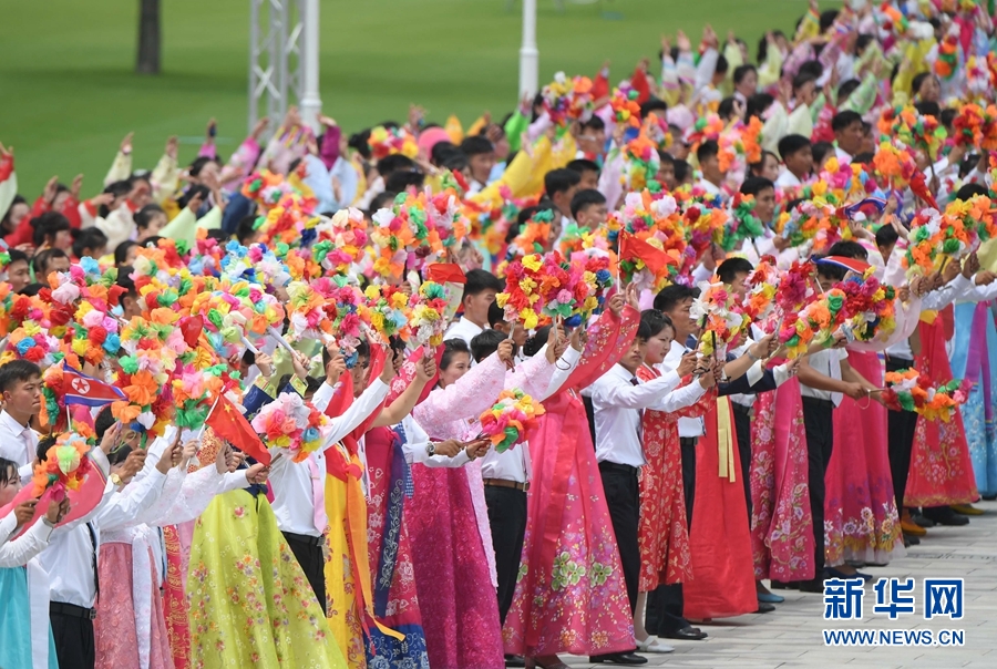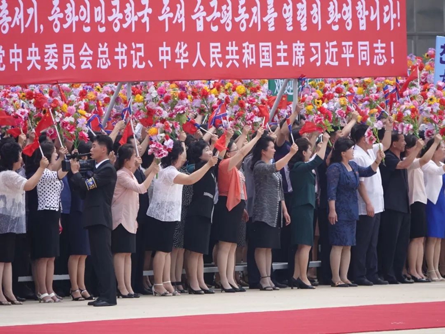 到處都是熱情的笑臉,友好的歡呼聲不絕于耳。習(xí)近平和金正恩向歡迎的人群頻頻揮手致意。