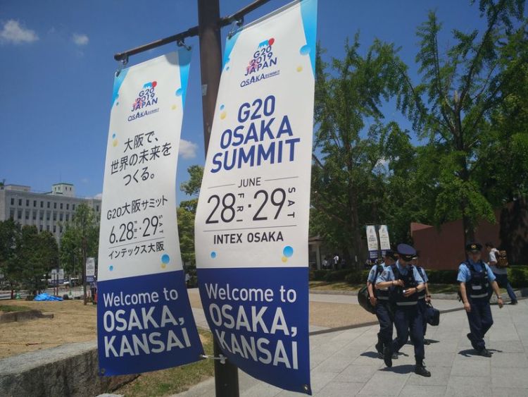 入夏的大阪,驕陽燦爛,綠意蔥蘢,海風(fēng)輕拂路人。隨著峰會臨近,在大阪主要景區(qū)、酒店、商廈及干道,均可以看到帶有二十國集團(tuán)領(lǐng)導(dǎo)人大阪峰會元素的標(biāo)牌、海報和條幅。