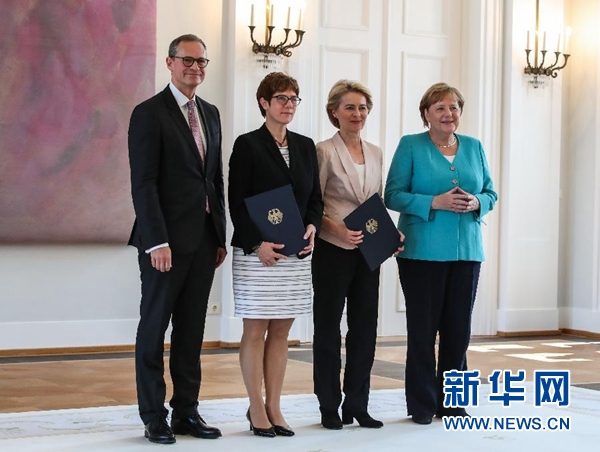 克蘭普-卡倫鮑爾當(dāng)天在德國總統(tǒng)府接受任命書。總理默克爾、馮德萊恩以及聯(lián)邦參議院第一副議長米歇爾·穆勒出席任命儀式。