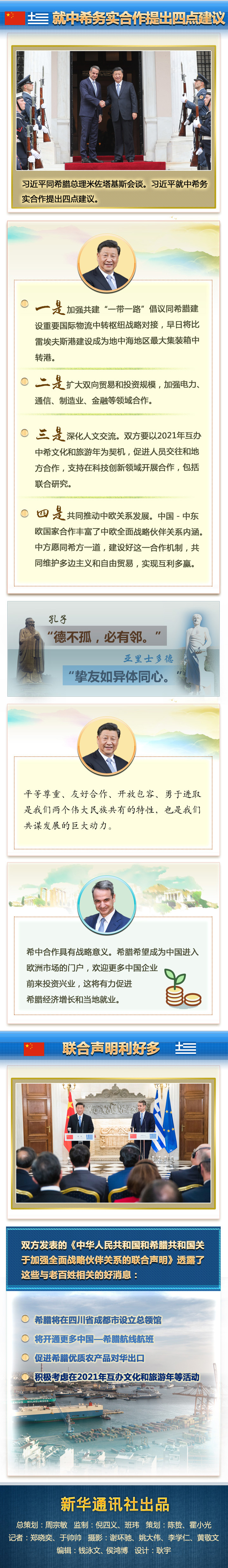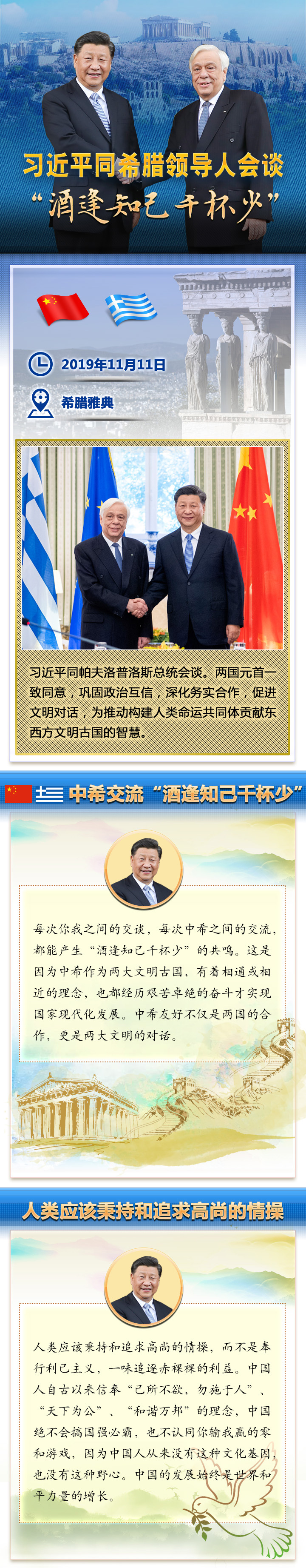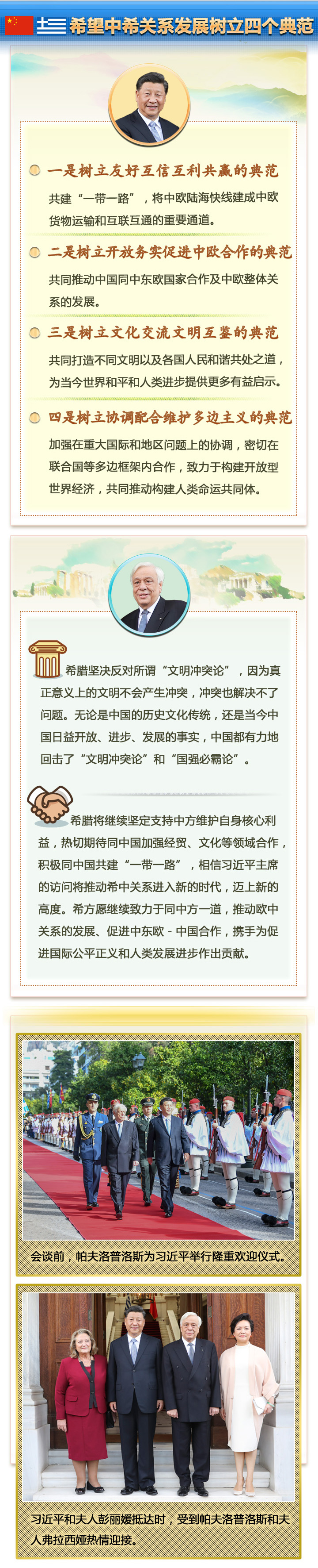 新華社雅典11月12日電 國(guó)家主席習(xí)近平11月10日晚抵達(dá)雅典,開始對(duì)希臘進(jìn)行國(guó)事訪問(wèn)。11日上午,習(xí)主席的訪問(wèn)活動(dòng)異常密集:向希臘無(wú)名戰(zhàn)士紀(jì)念碑獻(xiàn)花圈,出席希臘總統(tǒng)帕夫洛普洛斯舉行的隆重歡迎儀式并同帕夫洛普洛斯舉行會(huì)談,旋即又同總理米佐塔基斯舉行會(huì)談、出席合作文本交換儀式、共同會(huì)見記者。中希兩國(guó)領(lǐng)導(dǎo)人就雙邊關(guān)系及共同關(guān)心的國(guó)際和地區(qū)問(wèn)題深入交換意見,達(dá)成廣泛共識(shí)。