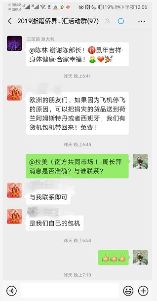 2月1日晚,浙江省僑界名媛匯微信群里的一則信息引起了大家的注意。“歐洲的朋友們,如果因?yàn)轱w機(jī)停飛的原因,可以把捐災(zāi)的貨品送到荷蘭阿姆斯特丹或者西班牙,我們有貨機(jī)包機(jī)帶回來!免費(fèi)!”群里瞬間沸騰,求助信息紛至沓來。省僑聯(lián)黨組書記、主席連小敏捕捉到這一信息,隨即高度重視,求證確認(rèn)后,第一時(shí)間研究討論,展開部署。