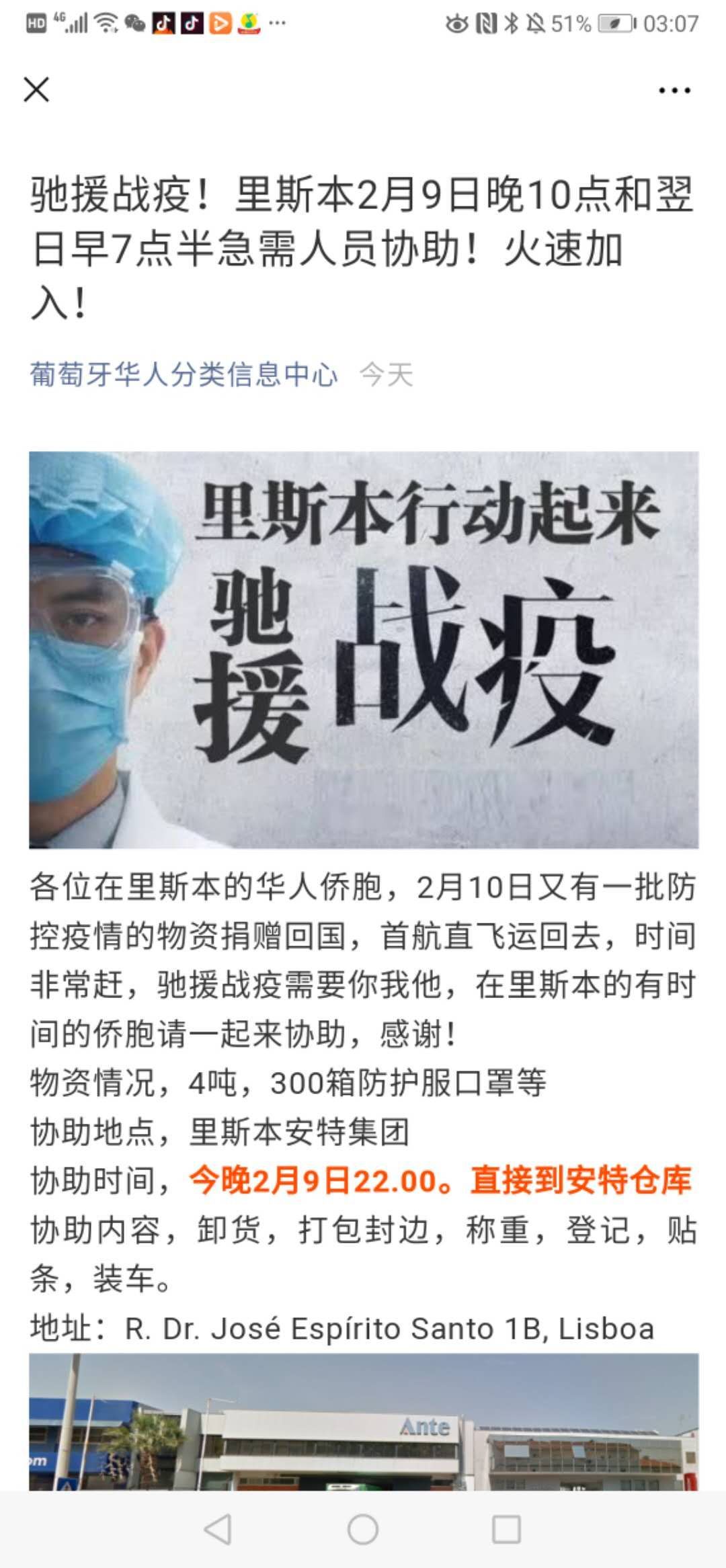 葡萄牙里斯本僑胞劉建云在獲悉省僑聯(lián)西班牙第二批物資因航班臨時(shí)取消必須分流至葡萄牙里斯本卻面臨物流運(yùn)送困難的信息時(shí),二話不說,立刻在微信群里吹響集結(jié)的號(hào)角:“由西班牙華人僑胞募捐籌集的20噸防護(hù)服、護(hù)目鏡和口罩等醫(yī)療物資,緊急轉(zhuǎn)運(yùn)葡萄牙交付首都航空中葡直航航班托運(yùn)回國(guó),當(dāng)晚22:30分急需人手卸貨、打包、裝車。有空的僑胞請(qǐng)接龍報(bào)名!”群里一呼百應(yīng),瞬時(shí)超員。當(dāng)晚就將西班牙運(yùn)送過來的捐贈(zèng)物資進(jìn)行重新打包直至深夜。
