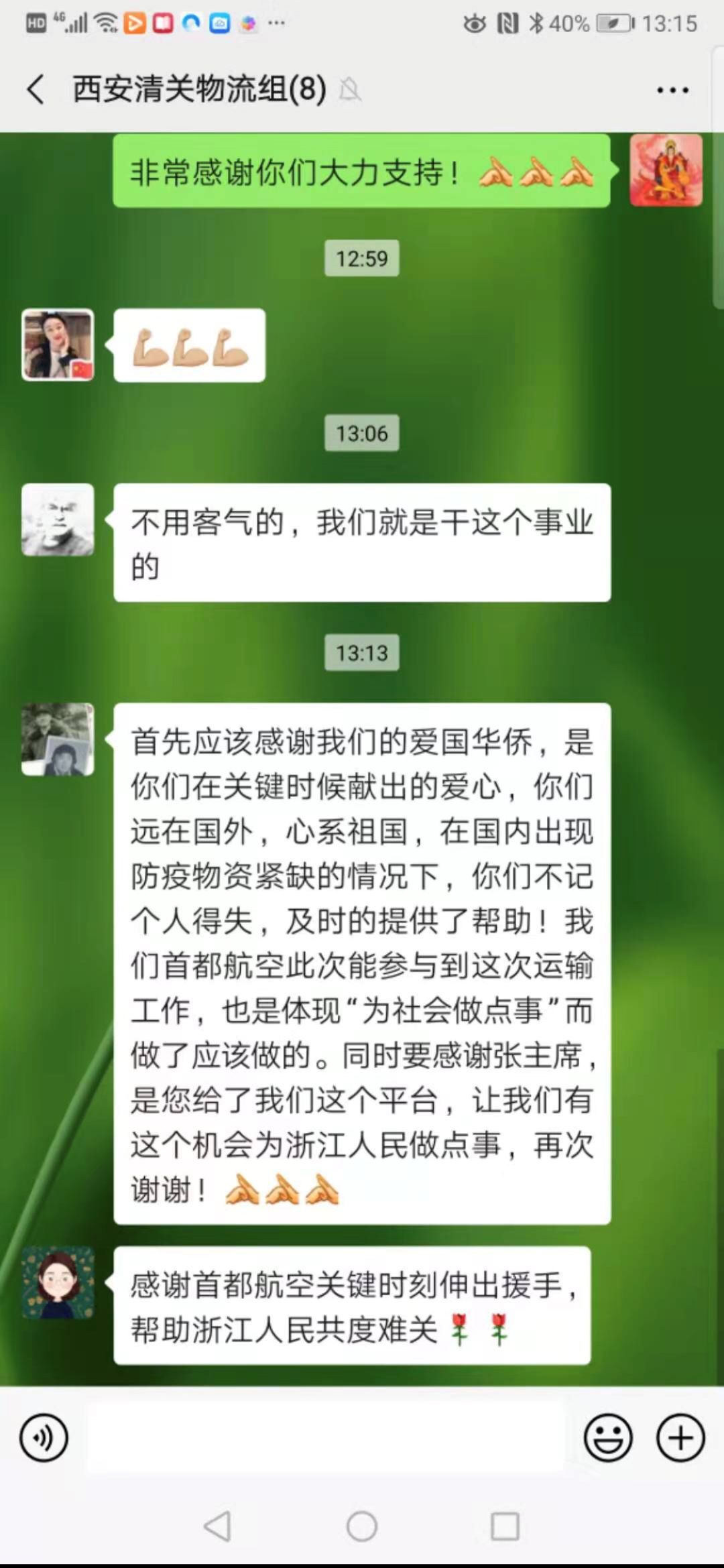 特別值得一提的是海航集團(tuán)的譚向東副董事長(zhǎng)、高建副總裁,為了協(xié)助我們把捐贈(zèng)物資盡快運(yùn)回國(guó)內(nèi),高度重視,靠前指揮,第一時(shí)間給予全面而具體的支持。旗下的首都航空公司市場(chǎng)部副總顧凌毅、貨運(yùn)中心高級(jí)經(jīng)理田國(guó)偉協(xié)調(diào)陳肖藝、倪福元、李小戈、首航西安基地總監(jiān)周瑞喜、海航速運(yùn)境外管理部副總經(jīng)理池夢(mèng)瑩以及郭宇萍等一批業(yè)務(wù)骨干加班加點(diǎn),克服了時(shí)間緊張,物資量大,境外時(shí)差等諸多困難,創(chuàng)造了許多個(gè)“首航第一次”。蟠龍國(guó)際集團(tuán)、中遠(yuǎn)海運(yùn)航空公司則為這場(chǎng)“空中接力”提供了高端快捷的航空物流平臺(tái)。而在第四批物資回運(yùn)過程中,更是得到了溫州市防疫指揮部的鼎力相助,幫助我們把西班牙巴塞羅那收集點(diǎn)上的捐贈(zèng)物資,從布魯塞爾轉(zhuǎn)道回國(guó)。