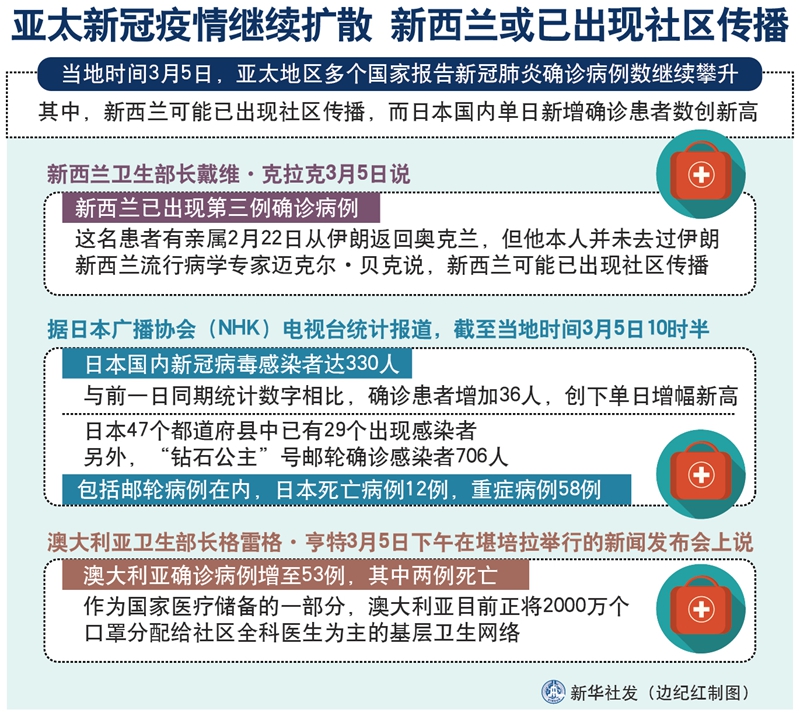 新華社北京3月5日電 綜合新華社駐外記者報道:亞太地區(qū)多個國家5日報告新冠肺炎確診病例數(shù)繼續(xù)攀升。其中,新西蘭可能已出現(xiàn)社區(qū)傳播,而日本國內(nèi)單日新增確診患者數(shù)創(chuàng)新高。