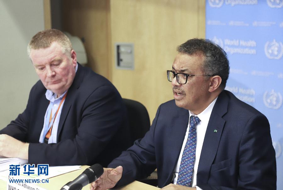 3月5日,在瑞士日內(nèi)瓦,世界衛(wèi)生組織總干事譚德塞(右)在世衛(wèi)組織例行記者會(huì)上發(fā)言。世界衛(wèi)生組織總干事譚德塞5日呼吁,各國(guó)應(yīng)調(diào)動(dòng)并協(xié)調(diào)政府各部門(mén)間的行動(dòng),以“全政府”參與的方式應(yīng)對(duì)新冠肺炎疫情。 新華社記者 陳俊俠 攝