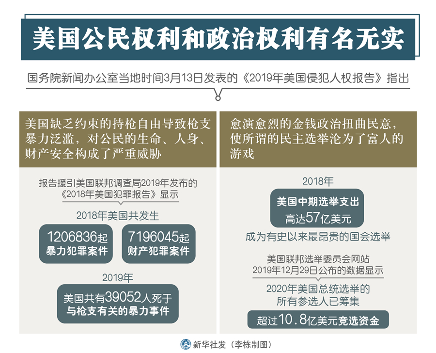 新華社北京3月13日電(記者王子銘、賈釗)國務(wù)院新聞辦公室13日發(fā)表的《2019年美國侵犯人權(quán)報(bào)告》指出,美國缺乏約束的持槍自由導(dǎo)致槍支暴力泛濫,對(duì)公民的生命、人身、財(cái)產(chǎn)安全構(gòu)成了嚴(yán)重威脅;愈演愈烈的金錢政治扭曲民意,使所謂的民主選舉淪為了富人的游戲。