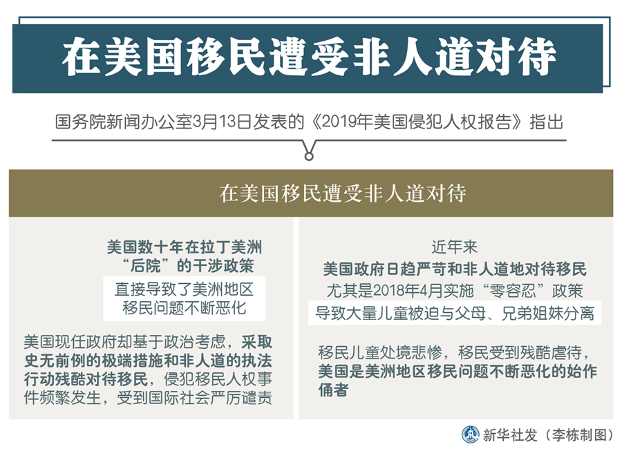 新華社北京3月13日電(記者王鵬、李超)國務(wù)院新聞辦13日發(fā)表的《2019年美國侵犯人權(quán)報(bào)告》指出,在美國移民遭受非人道對待。