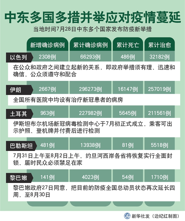 新華社突尼斯7月29日電 綜合新華社駐中東地區(qū)記者報道:為進一步應對中東多國持續(xù)蔓延的新冠疫情,同時防止因宰牲節(jié)人群聚集加劇疫情擴散,中東多個國家28日發(fā)布防疫新舉措。