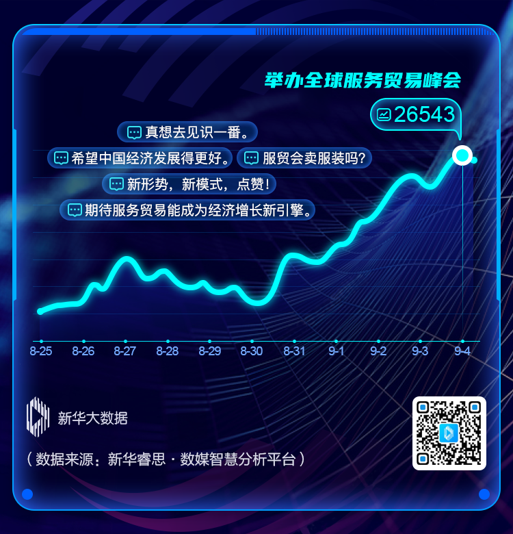 9月4日,2020年中國國際服務貿(mào)易交易會(簡稱服貿(mào)會)在北京開幕。作為疫情發(fā)生以來我國在線下舉辦的第一場重大國際經(jīng)貿(mào)活動,服貿(mào)會受到輿論廣泛關注,話題信息量不斷增加,網(wǎng)絡討論熱度更是高達96.57,位居話題熱度榜首。不少網(wǎng)民表示“真想去見識一番”“新形勢、新模式,點贊!”“期待服務貿(mào)易能成為經(jīng)濟增長新引擎”。但面對鋪天蓋地的服貿(mào)會相關信息,也有部分網(wǎng)民表示“疑惑”,“服貿(mào)會賣服裝嗎?”“服貿(mào)會上都展出什么服務呢?”……