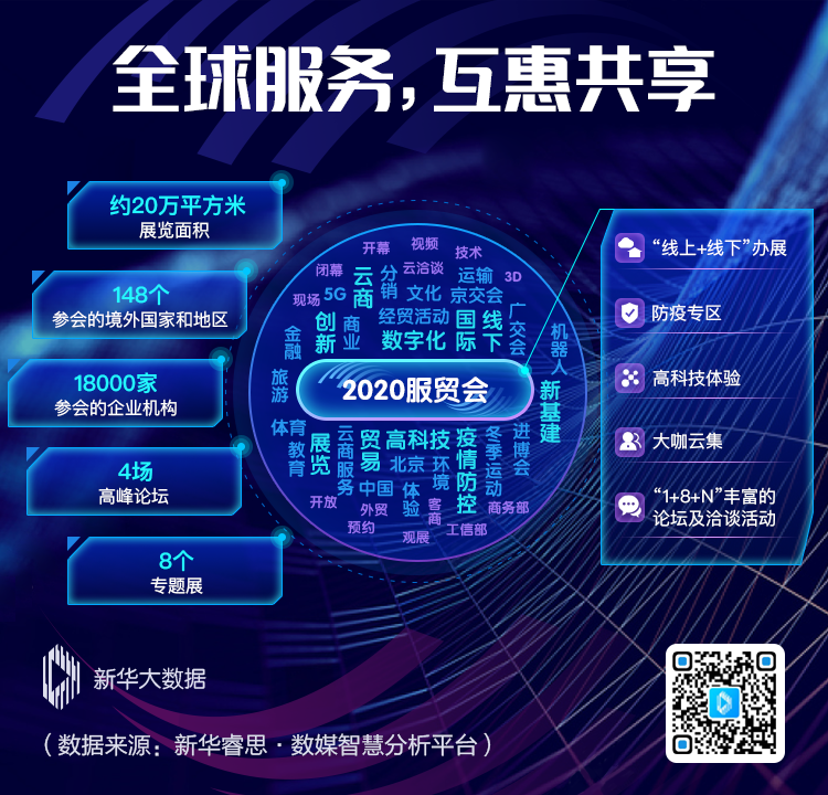 今年展會包括了1個綜合展、8個專題展及若干功能服務區(qū)。其中綜合展包括公共衛(wèi)生防疫專區(qū)、國別和?。ㄗ灾螀^(qū)、直轄市)專區(qū)、服務貿(mào)易十二大領域企業(yè)專區(qū);專題展則突出打造文化、金融、冬季運動、旅游、教育、體育、服務機器人和5G通信服務等服務領域行業(yè)特色。