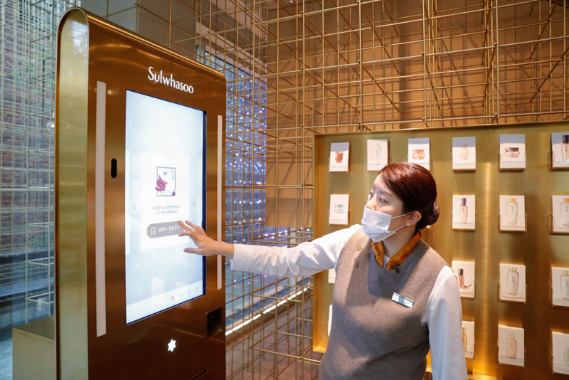 10月27日,工作人員在位于韓國(guó)首爾江南區(qū)的愛(ài)茉莉太平洋雪花秀旗艦店內(nèi)指導(dǎo)客人體驗(yàn)店內(nèi)設(shè)施??偛课挥陧n國(guó)首爾的美妝企業(yè)愛(ài)茉莉太平洋集團(tuán)今年將連續(xù)第三次參加進(jìn)博會(huì)。新華社記者 王婧嬙 攝