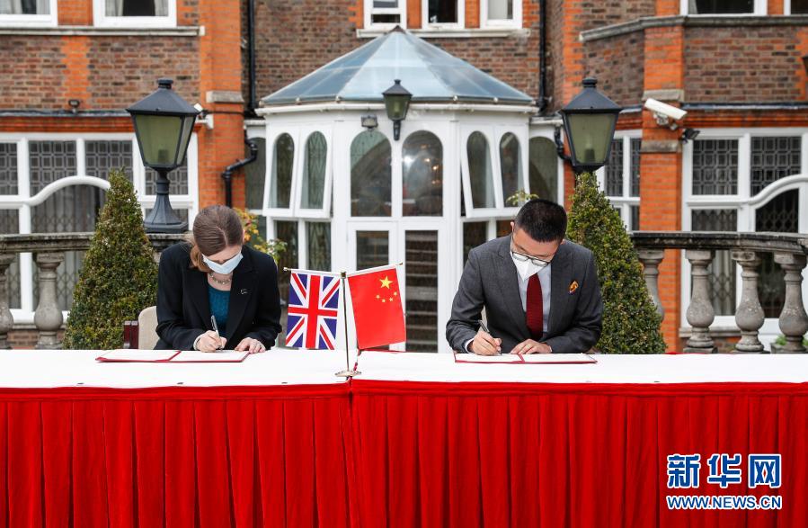 10月16日,在英國倫敦,代表中國國家文物局的中國駐英國大使館文化處一秘于果(右)和代表英國大都會(huì)警察局的探員蘇菲·海斯簽署文物接收確認(rèn)書。新華社記者 韓巖 攝