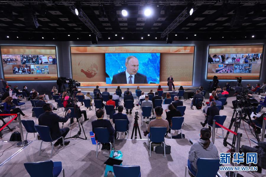12月17日,在俄羅斯首都莫斯科,普京年度記者會(huì)以視頻方式舉行。當(dāng)日,俄羅斯總統(tǒng)普京在莫斯科召開(kāi)年度記者會(huì)。受疫情影響,本次年度記者會(huì)以普京在莫斯科郊區(qū)的官邸通過(guò)視頻與記者交流的方式舉行。新華社發(fā)(葉甫蓋尼·西尼岑攝)