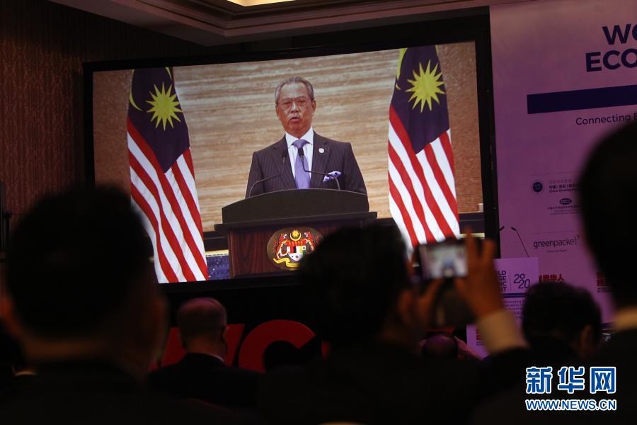 12月21日,在馬來西亞吉隆坡舉行的世界華人經(jīng)濟峰會上,大屏幕播放馬來西亞總理穆希丁的視頻講話。新華社發(fā)