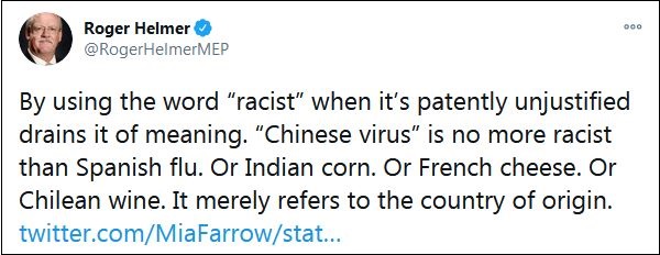 大量網(wǎng)友在他的這條推特下,挖出赫爾默曾經(jīng)發(fā)表的言論。例如早在3月17日,赫爾默就在一條推特中宣稱(chēng):“在明顯不合理的情況下,使用‘種族主義’這個(gè)詞會(huì)讓它失去意義?!袊?guó)病毒’和‘西班牙流感’一樣不是種族主義。就像印度玉米,或法國(guó)奶酪,或者智利葡萄酒。它僅僅是指原產(chǎn)國(guó)?!?/p>