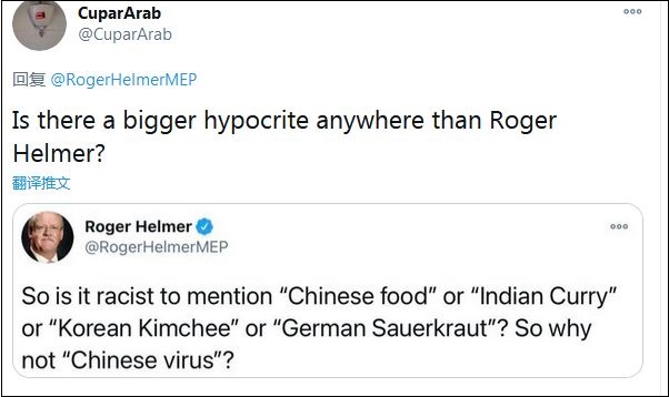 不料,這條評(píng)論徹底“翻車(chē)”。赫爾默是一名英國(guó)獨(dú)立黨成員,政治立場(chǎng)偏保守,批評(píng)英國(guó)的國(guó)家醫(yī)療服務(wù)體系(NHS),并否定歐盟的氣候政策。過(guò)去一年間,他曾多次將新冠病毒污蔑為“中國(guó)病毒”,還曾轉(zhuǎn)發(fā)過(guò)特朗普的相關(guān)視頻。