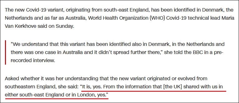 12月20日,世衛(wèi)組織緊急項(xiàng)目技術(shù)主管瑪麗亞·范·克爾科夫(Maria Van Kerkhove)曾在采訪(fǎng)中被問(wèn)及變異病毒是否起源或在英國(guó)東南部進(jìn)化的問(wèn)題,她回答說(shuō):“是的。從英國(guó)和我們分享的信息來(lái)看,要么是在英國(guó)東南部,要么是在倫敦。是的?!?/p>
