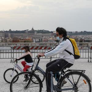 4月3日,人們騎車經(jīng)過意大利羅馬的蘋丘觀景臺(tái)。