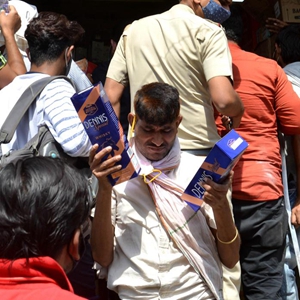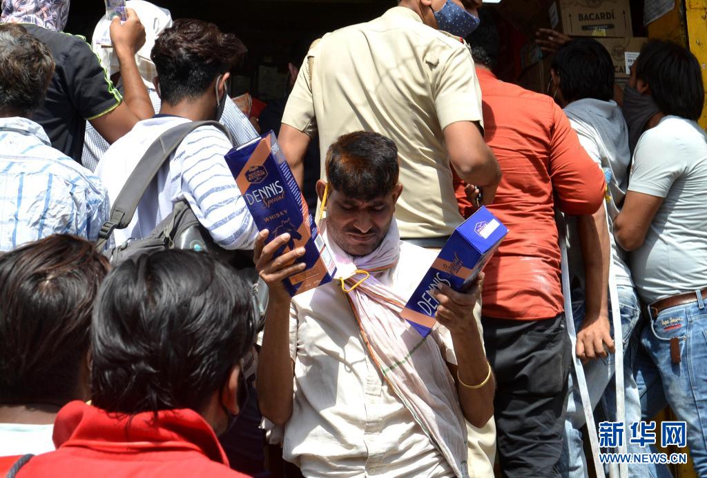 4月19日,印度新德里居民在全城實(shí)施封鎖前搶購(gòu)酒品。