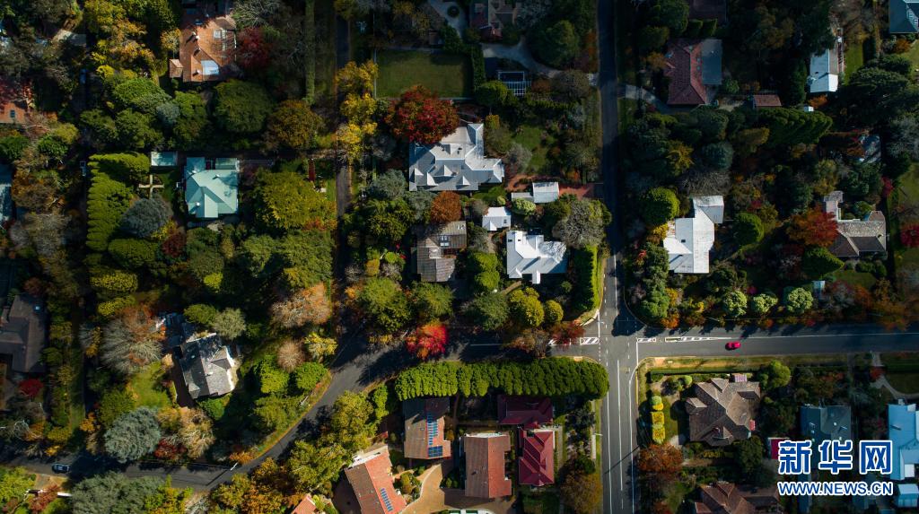 這是5月3日在澳大利亞悉尼西部藍(lán)山地區(qū)拍攝的多彩的街道(無人機(jī)拍攝)。