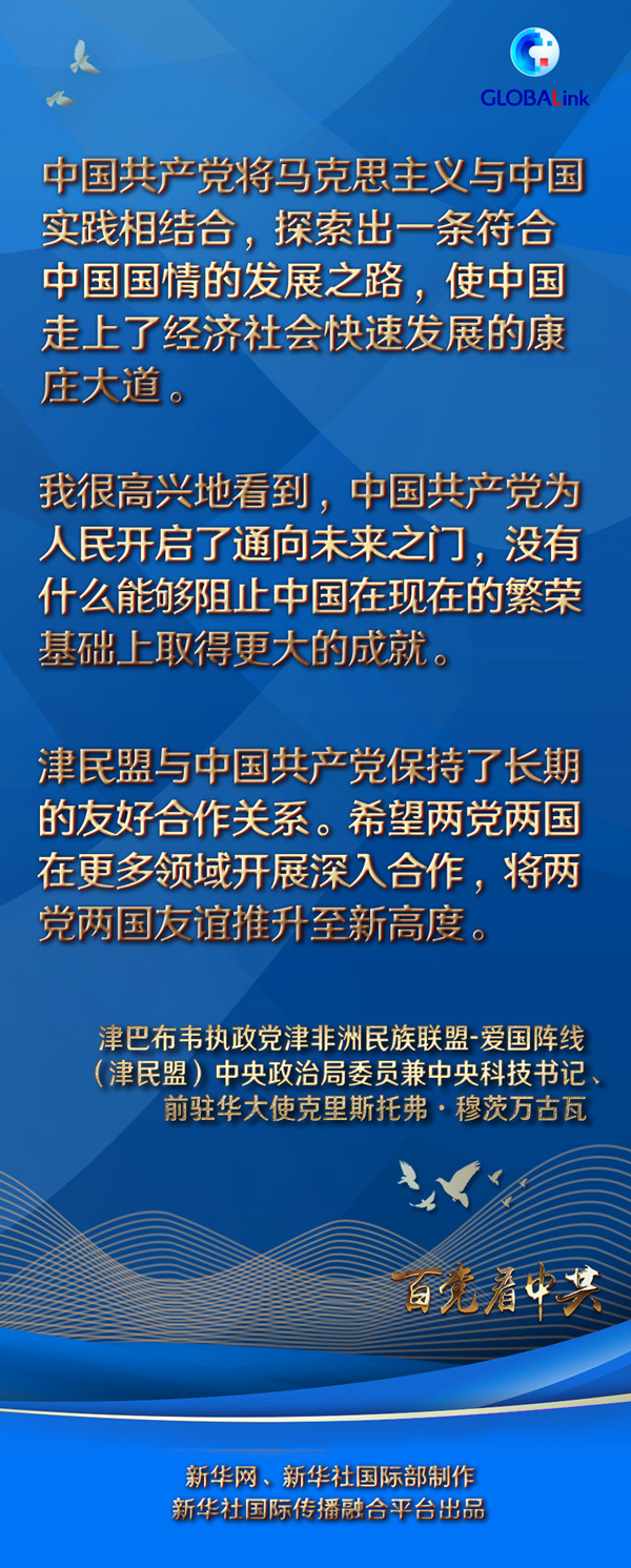 “我很高興地看到,中國(guó)共產(chǎn)黨為人民開啟了通向未來之門,沒有什么能夠阻止中國(guó)在現(xiàn)在的繁榮基礎(chǔ)上取得更大的成就。”穆茨萬古瓦說,津民盟和他本人對(duì)中國(guó)共產(chǎn)黨帶領(lǐng)中國(guó)人民所取得的偉大成就表示贊嘆,祝愿中國(guó)在未來取得更大的發(fā)展成就。他希望兩黨兩國(guó)在更多領(lǐng)域開展深入合作,將兩黨兩國(guó)友誼推升至新高度。