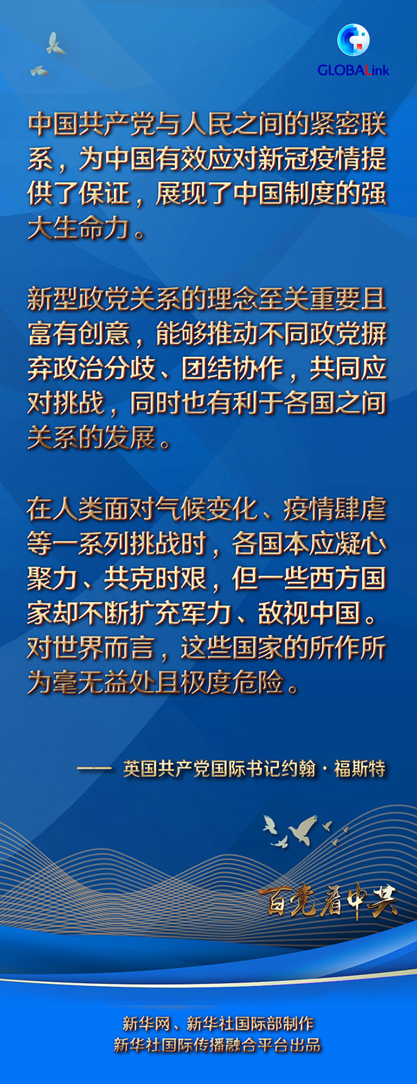 福斯特表示,作為一個領導著世界上人口最多國家的百年大黨,中共倡導建立新型政黨關系和構建人類命運共同體,對促進世界的和平與發(fā)展具有重要意義。