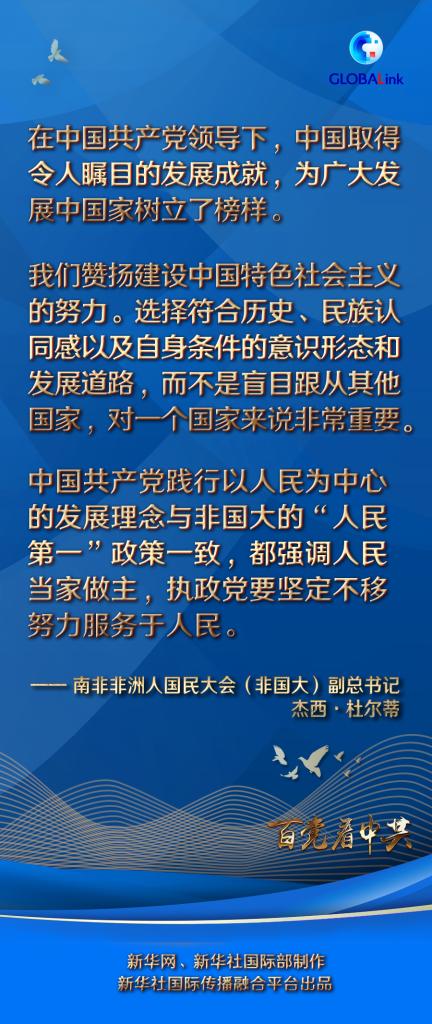 新華社約翰內(nèi)斯堡6月10日電 在中國(guó)共產(chǎn)黨領(lǐng)導(dǎo)下,中國(guó)取得令人矚目的發(fā)展成就,為廣大發(fā)展中國(guó)家樹立了榜樣,南非非洲人國(guó)民大會(huì)(非國(guó)大)副總書記杰西·杜爾蒂日前在接受新華社記者采訪時(shí)如是說(shuō)。