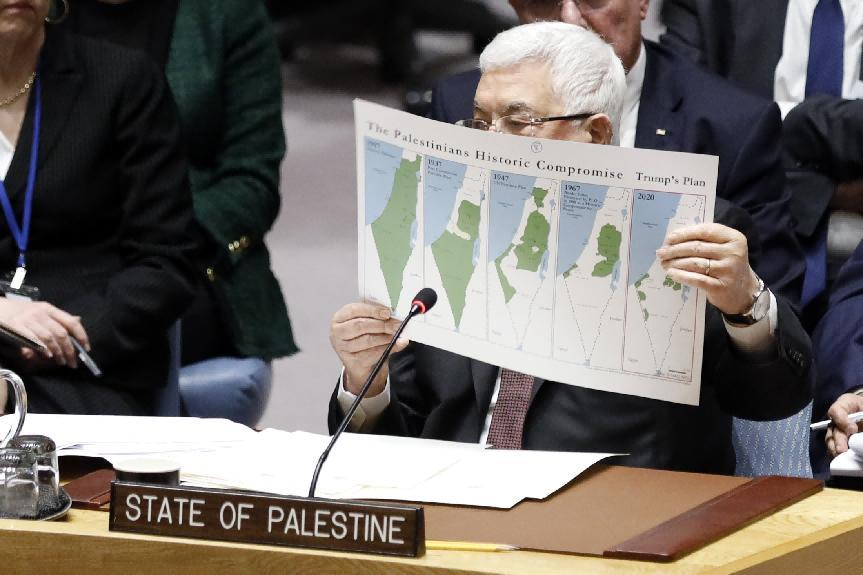 2020年2月11日,在位于纽约的联合国总部,巴勒斯坦总统阿巴斯在安理会中东局势和巴勒斯坦问题公开会上手持地图发言。 新华社记者 李木子 摄