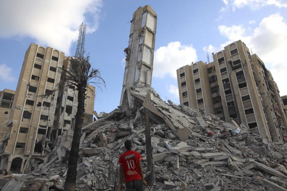 2024年7月26日,在加沙地带中部努赛赖特难民营,一名男子查看一片建筑废墟。新华社发(马尔万·达乌德摄)