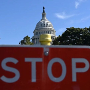 这是10月1日在美国华盛顿拍摄的美国国会大厦和交通标志。新华社记者 李睿 摄