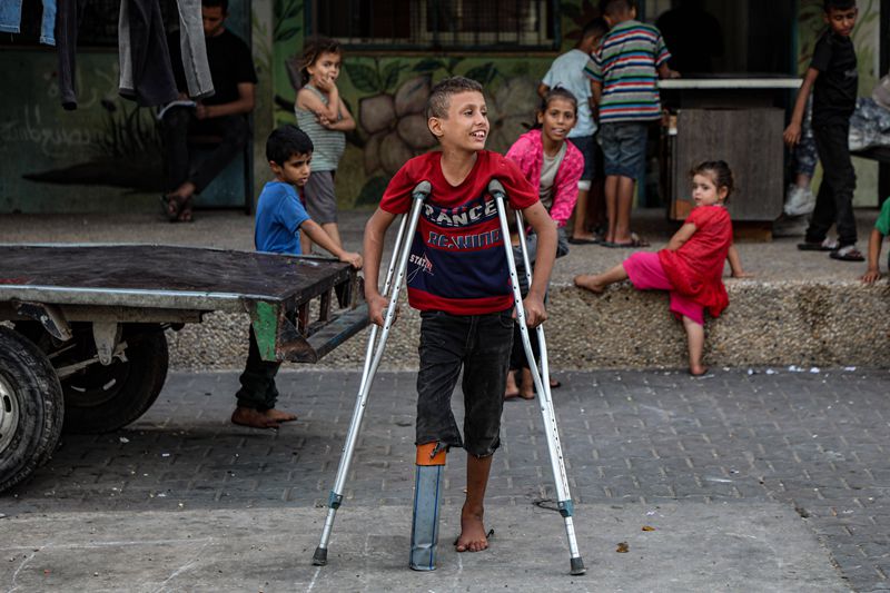 10月5日,年仅10岁的少年拉提卜·阿布·卡里克在加沙地带中部代尔拜拉赫附近的联合国临时安置机构内拄着拐杖行走。在数月前的一次以色列空袭中,拉提卜失去了右腿致残,他的母亲和兄弟也在袭击中身亡。 新华社发(里泽克·阿卜杜勒贾瓦德摄)