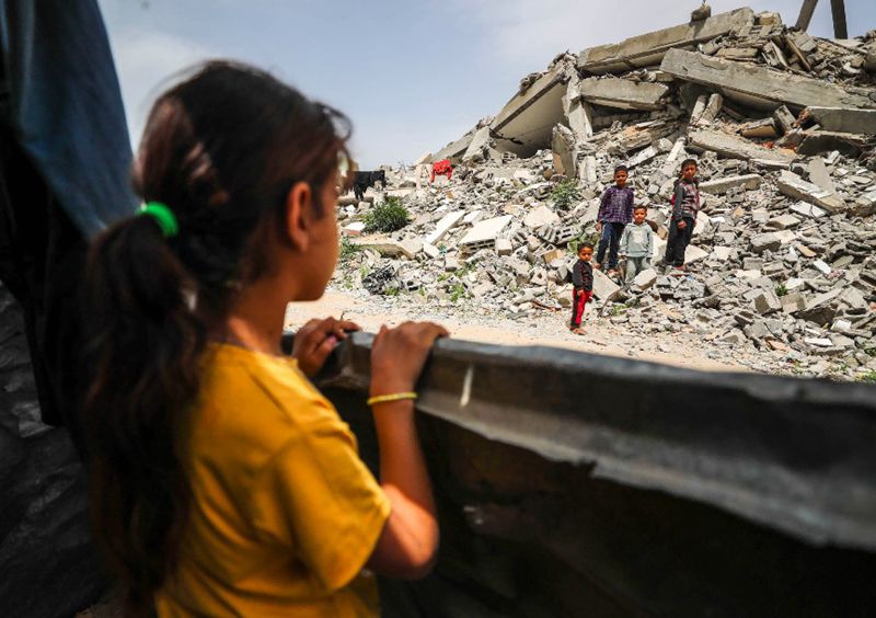 这是2025年4月7日在加沙地带北部加沙城拍摄的流离失所的儿童。新华社发(马哈茂德·扎基摄)
