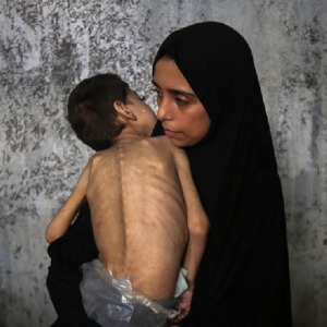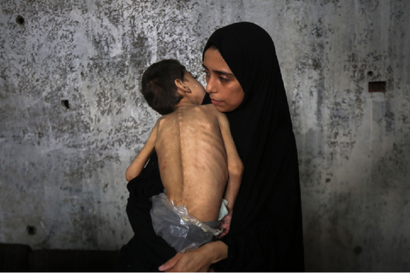 7月25日,在加沙城一处避难所,一名女子怀抱营养不良并患病的儿童。新华社发(里泽克·阿卜杜勒贾瓦德摄)